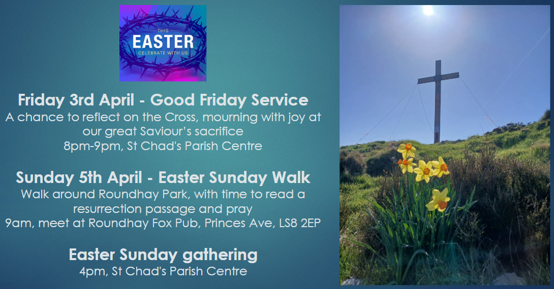We meet at St Chad's Parish Centre on Otley Road and our service starts at 4:00pm.